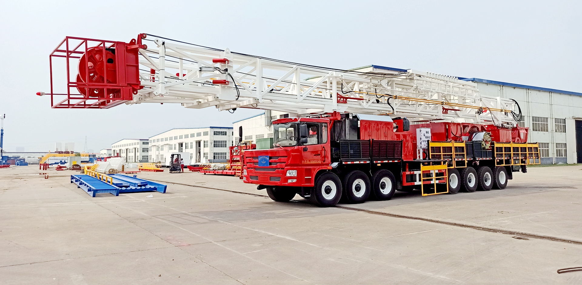 車裝鉆機是將動力系統、絞車、井架、游車系統及傳動系統等部件全部裝載于自走式底盤上。具有作業負荷大、性能可靠、越野能力強、移運方便,作業和搬遷費用低等特點。